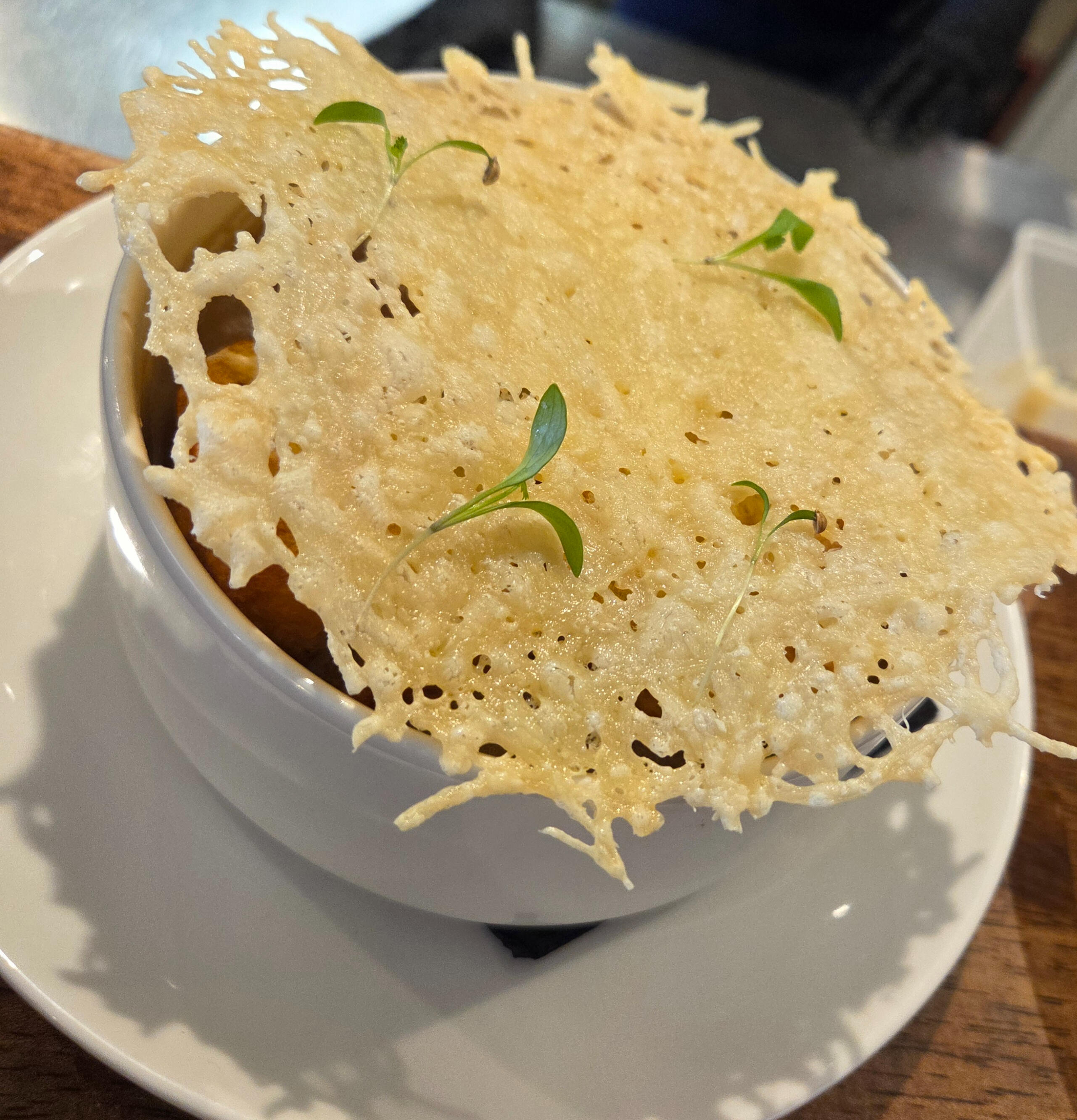 Soupe à l'oignon gratinée au comté ,croûtons frottés à l'ail et chips d'emmental..12,00 €